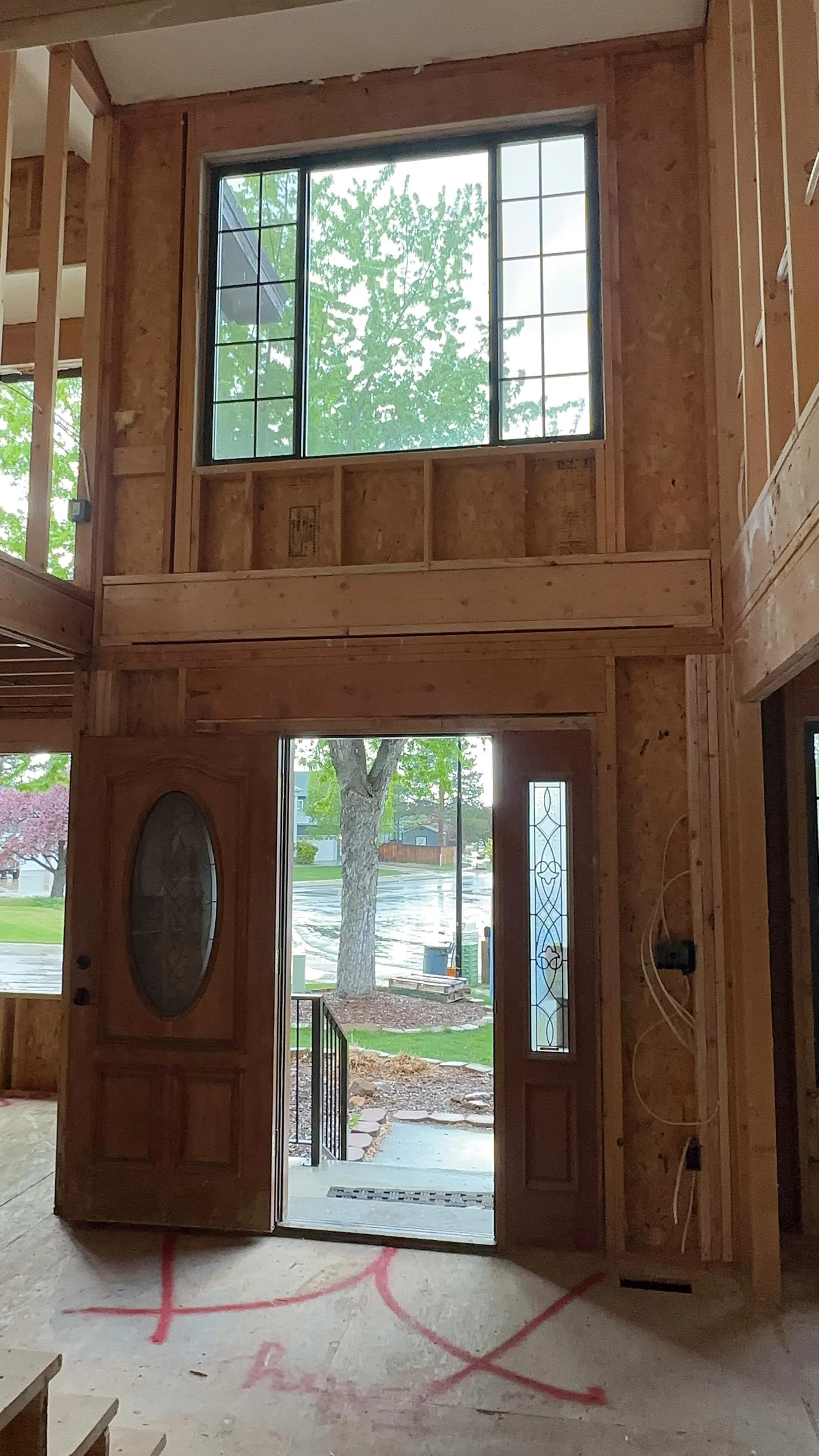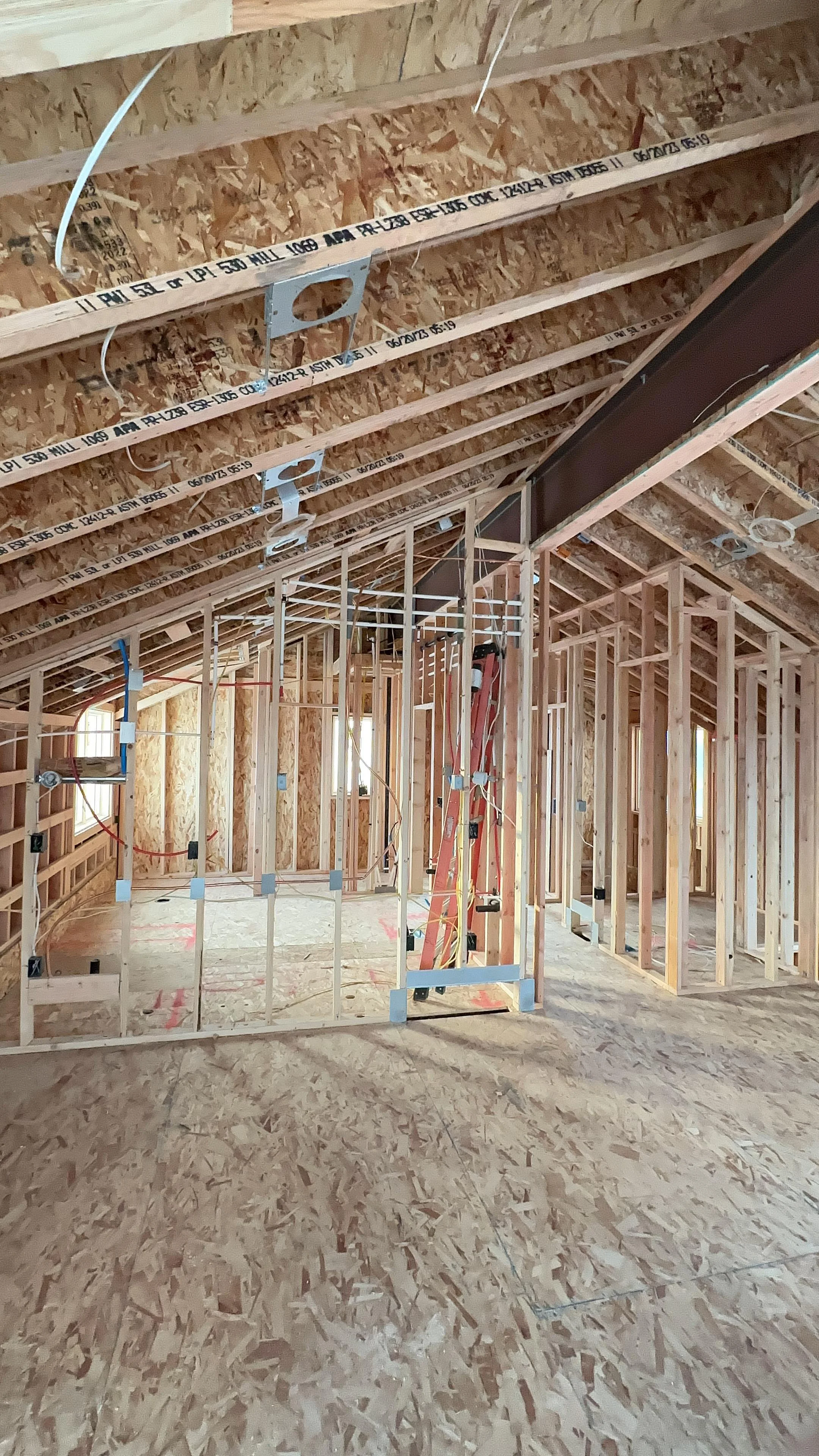A two-story house under construction with plywood exterior and incomplete roofing, located in a residential area with nearby houses and construction materials visible.